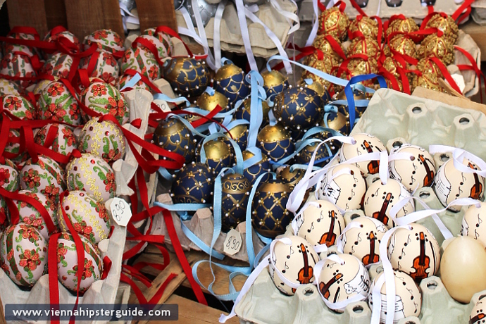 Jedes Jahr ein paar Wochen vor Ostern findest du auf diesen Märkten wunderschön handbemalte Eier – besonders auf dem Altwiener Ostermarkt auf der Freyung. Diese Eier sind wirklich etwas Besonderes. Sie zeigen nicht nur klassische Ostermotive mit Hasen und so, sondern auch viele künstlerische Designs, manchmal inspiriert von österreichischen Künstlern wie Klimt oder Schiele. Und natürlich gibt es auch Wien-Motive – bemalte Eier mit Wahrzeichen wie dem Schloss Schönbrunn oder den Lipizzaner-Pferden.